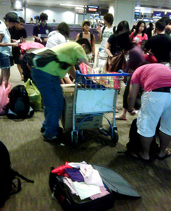 No Fondling. Avoid handling baggage that isn’t yours. Some people are quite touchy about this. If someone’s poorly placed bag is blocking your access to the bin, ask permission to move their bag to make room for yours.