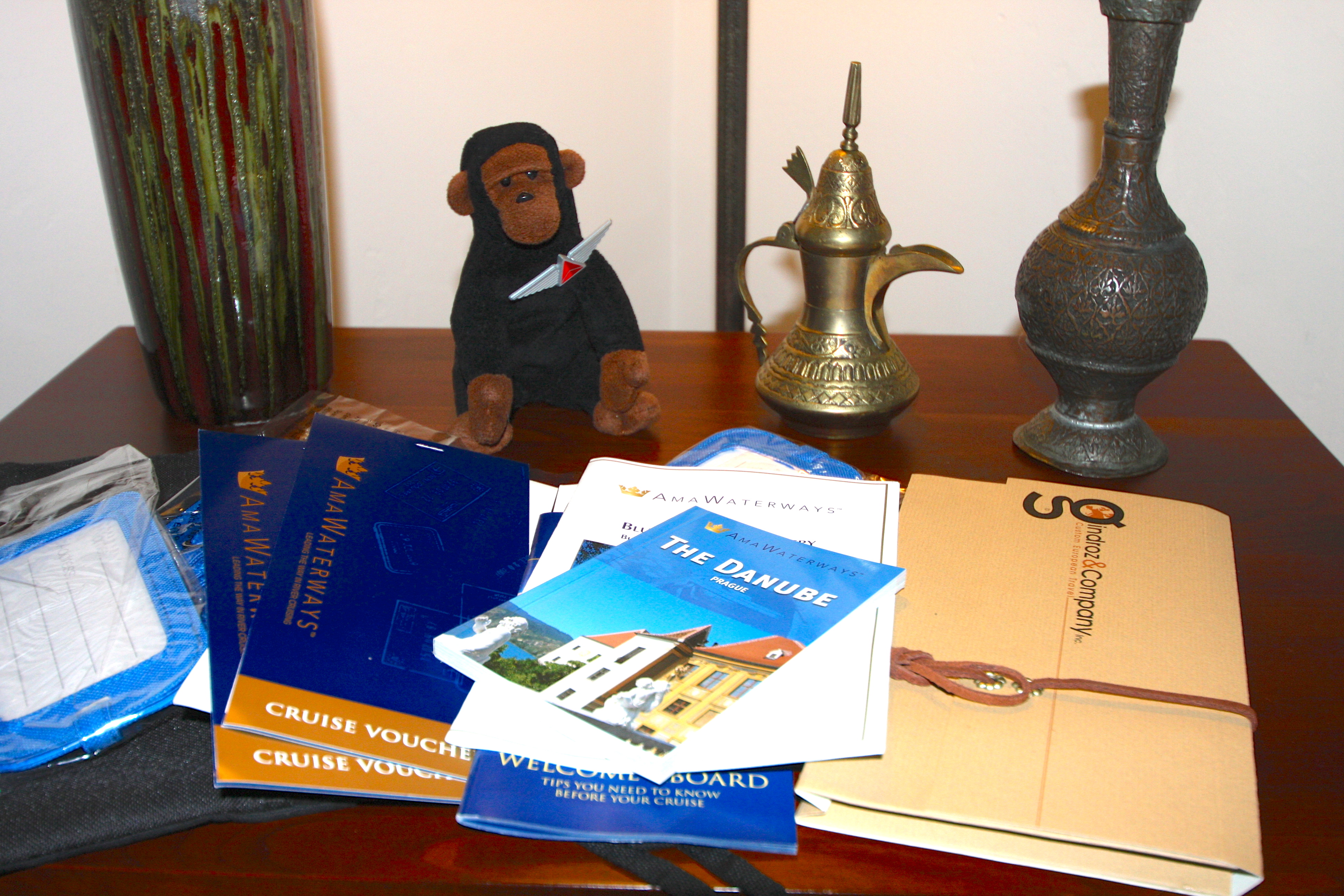 The anticipation level really amps up when the documents arrive. Kongo now has all his vouchers, new luggage tags from the cruise line, brochures, and nifty little canvas bags to put all the important papers in. He’s getting close.