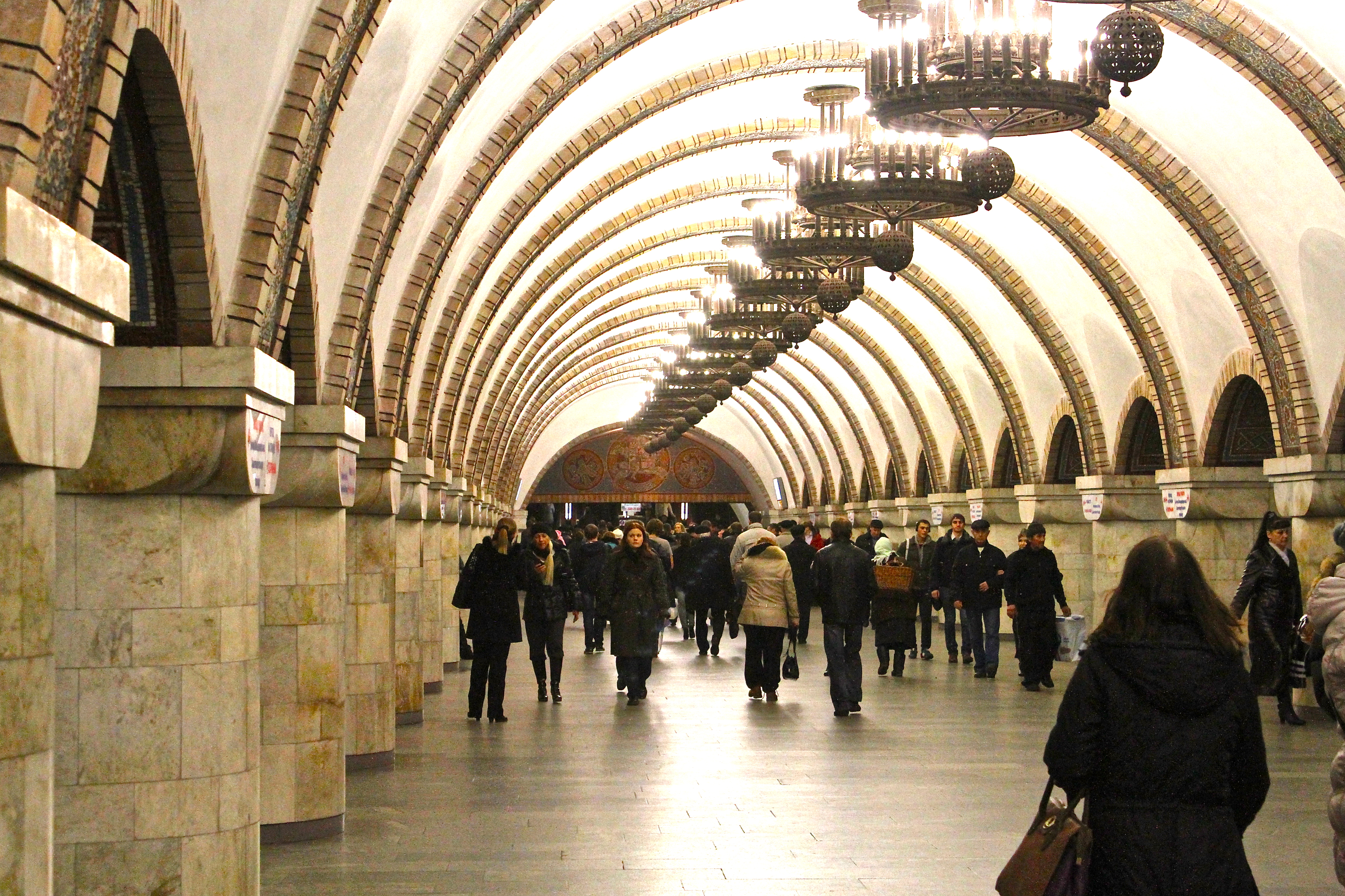 The Kiev Metro Station, Zoloti Vorata (Golden Gate) is more than 340 feet underground.  Build during the 1980s when Ukraine was part of the USSR, this beautiful station is designed in a Ukrainian style.  It takes two escalator rides to get to the boarding area.
