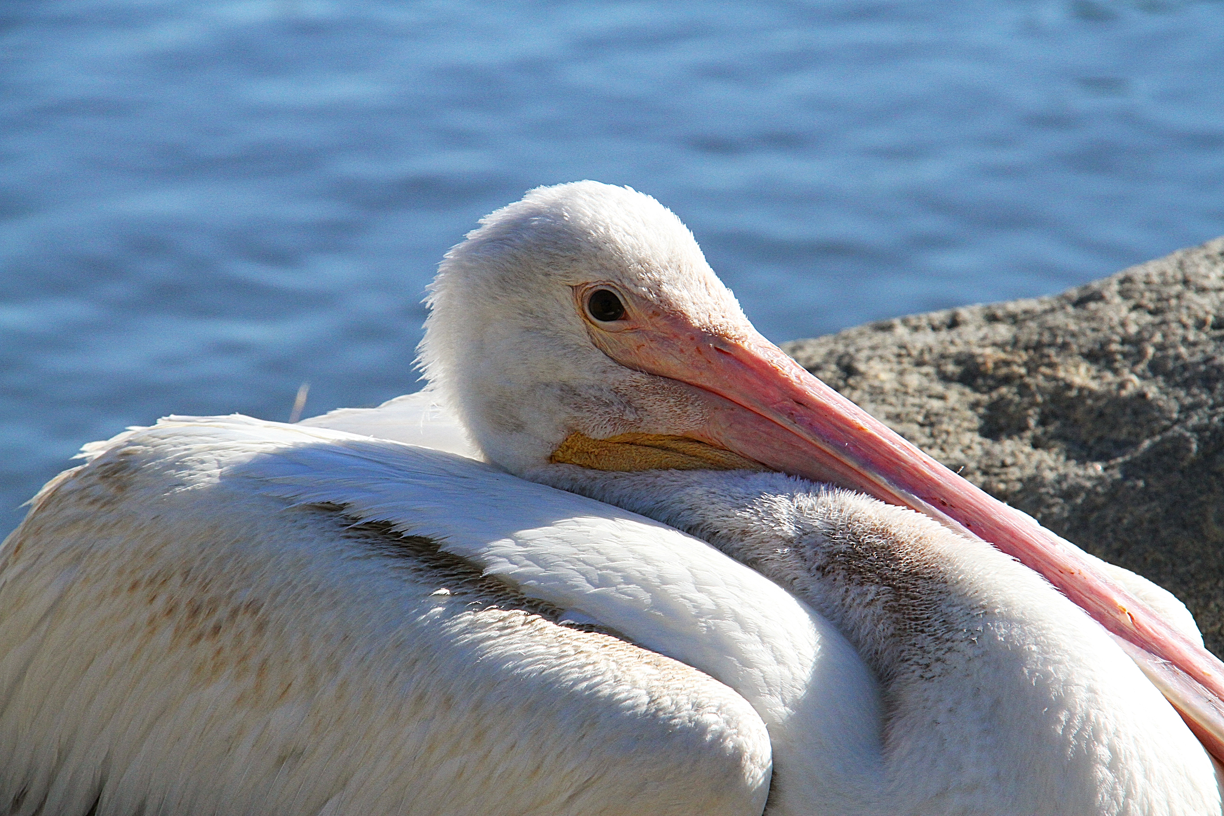 Kongo fetched his new Christmas tripod and headed over to nearby Santee Lakes to see what birds were out and about this beautiful San Diego afternoon. He came across this white pelican sitting on the grass and was able to get close. Evidently pelicans don’t mind monkeys.