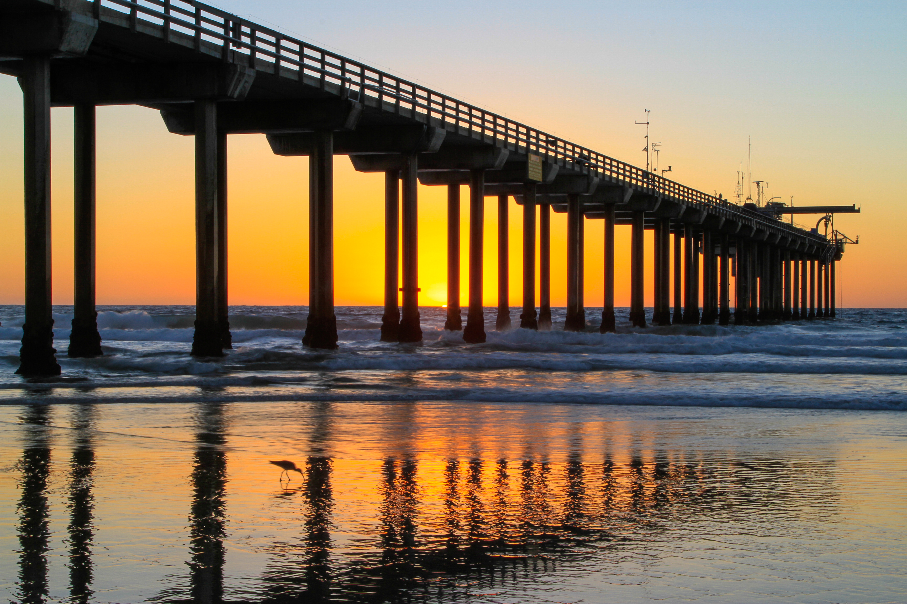 The Scripps Pier at sunset.  This research pier is located between La Jolla Shores and Black’s Beach in La Jolla.  Kongo snapped this image shortly before he moved beneath the pier to get the shot in the previous post.  He liked the reflection on the sand and the sandpiper who stood still long enough not to be blurry in this 3-second exposure.