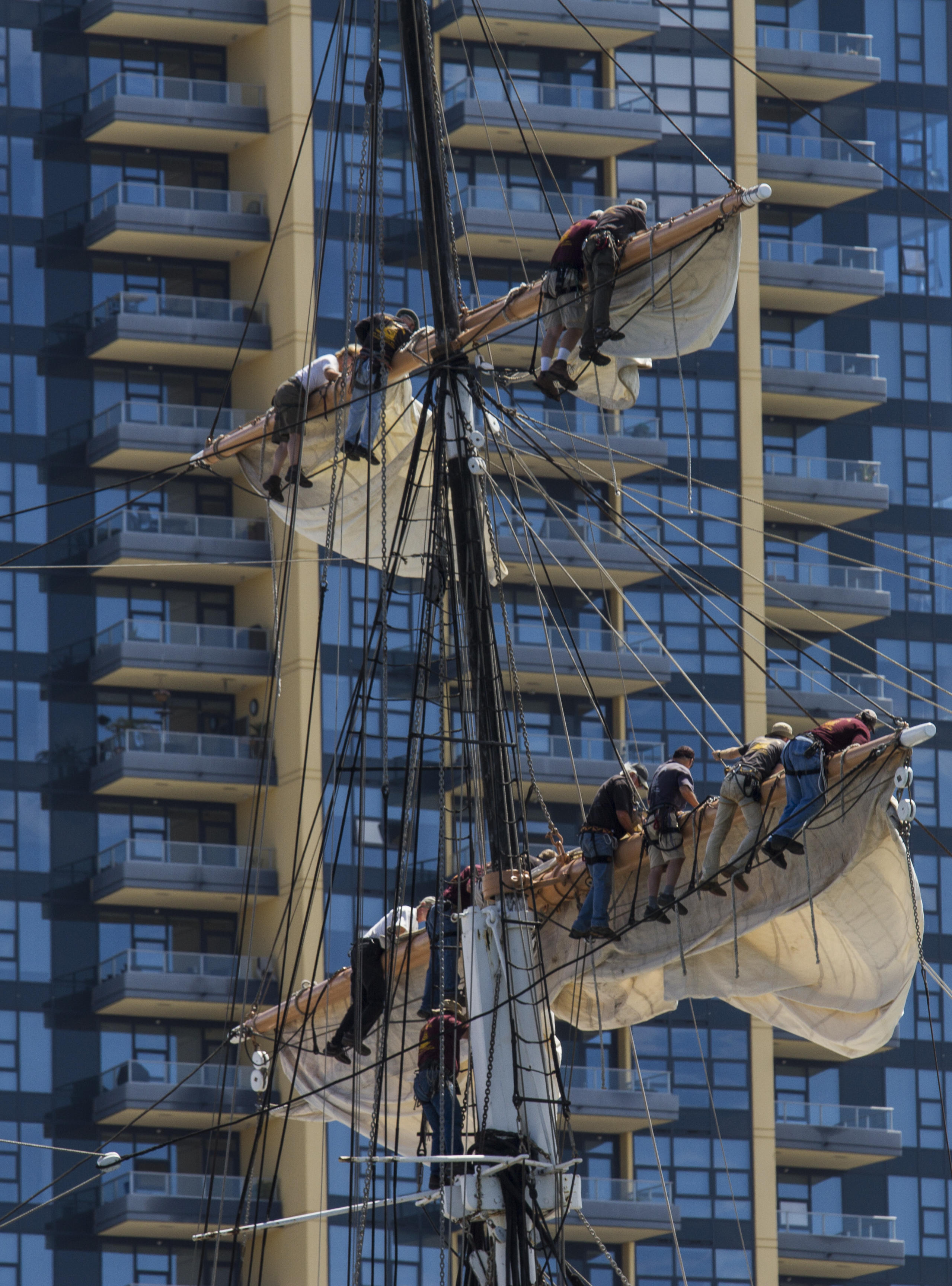This week’s photo challenge is juxtaposition. That’s the side-by-side comparison of two things to emphasize contrast. In this image sailors unfurl the sails of the 19th century Star of India against the backdrop of a 21st century high-rise condominium tower in downtown San Diego. See more juxtaposed images at the WordPress Weekly Photo Challenge.