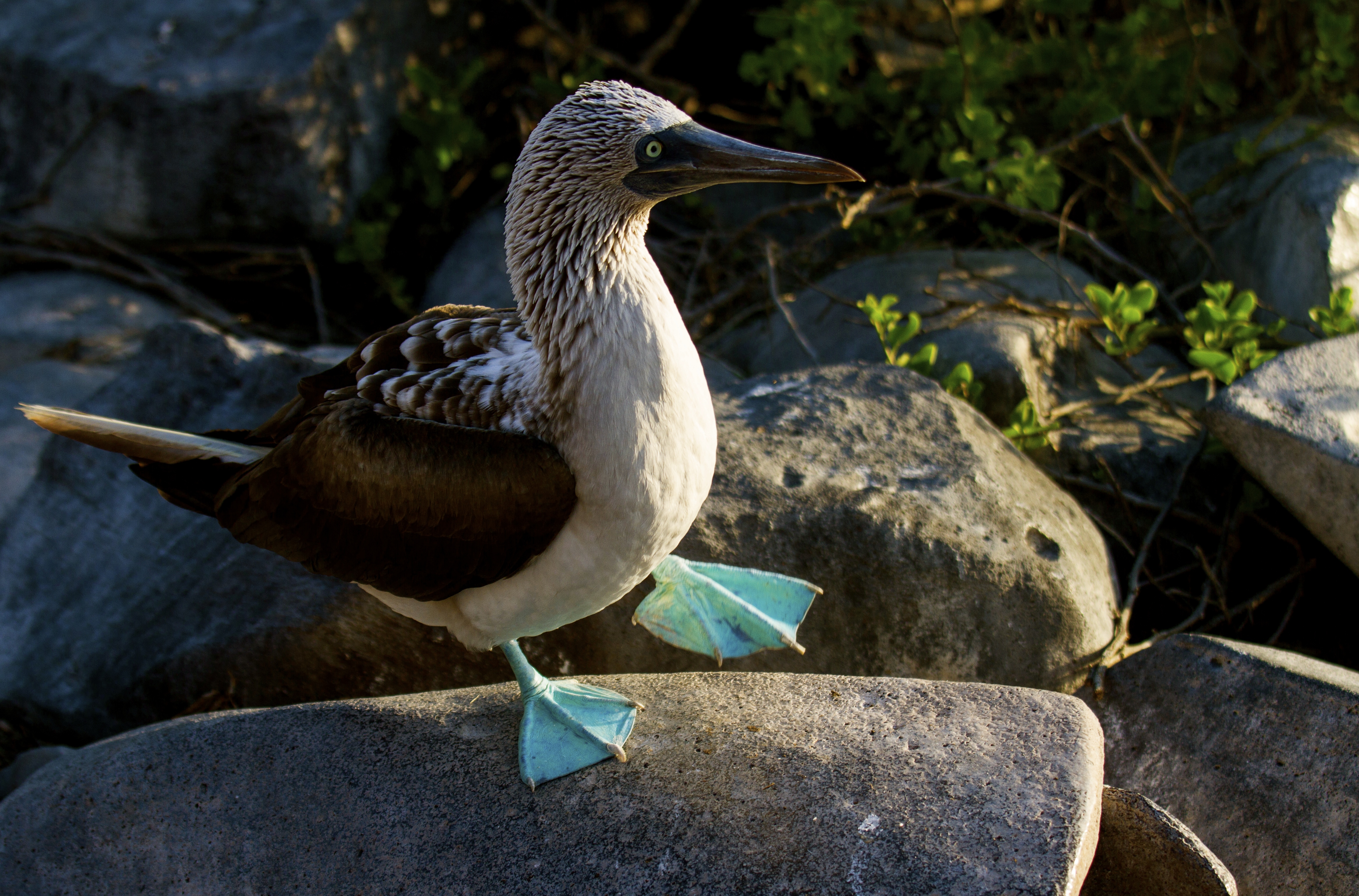 Above, a booby perches on the cliffs of Santa Cruz Island.
